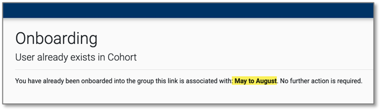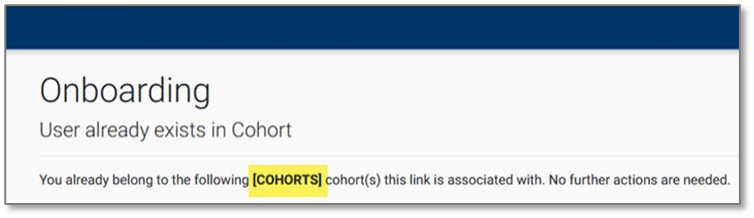 When a user has already completed the ‘one-click’ onboarding process and tries to onboard again using the same ‘one-click’ onboarding link, the following screen is displayed with placeholder text instead of the name of the cohort. This issue has been resolved to display the name of the cohort.
